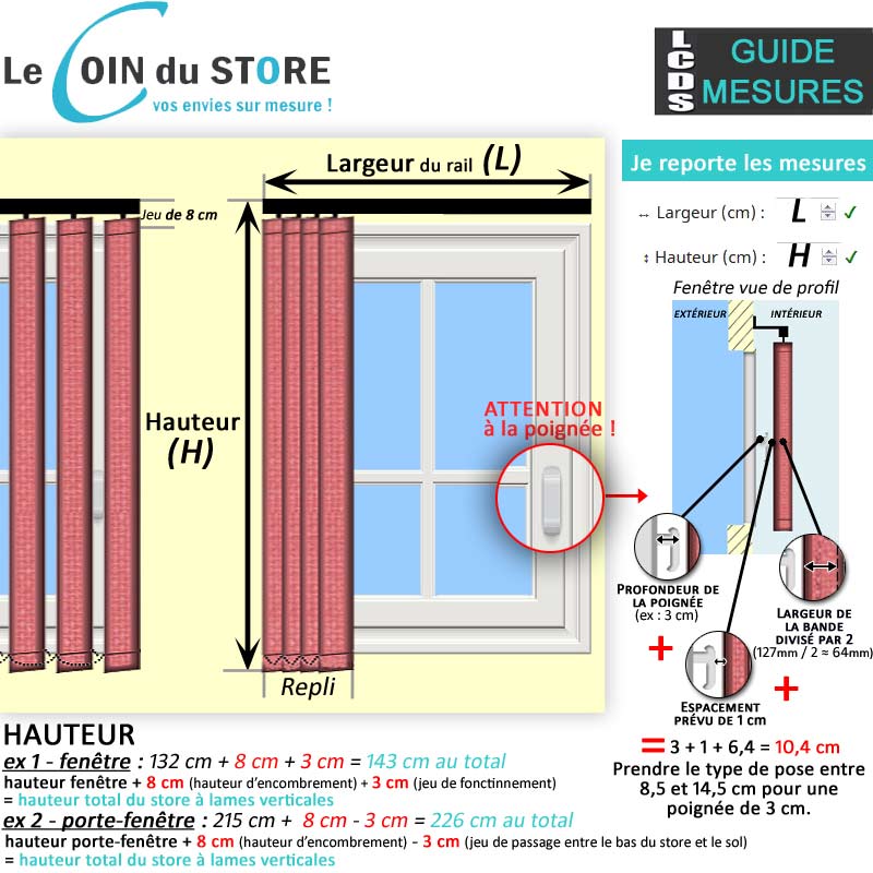 Prises de mesure store californien à bandes verticales. Pour prendre les mesures de votre store, la largeur est égale à la (largeur de la fenêtre + 10 cm), et la hauteur correspond au (rail + les bandes). Exemple : Vous souhaitez couvrir une fenêtre d'une largeur de 100 cm, il est conseillé d'y ajouter 5 cm à droite + 5 cm à gauche, vous obtiendrez alors un total de 110 cm. Ensuite, on mesure la hauteur, qui est de 120 cm, à laquelle on ajoute 10 cm pour les équerres de fixation qui font 8 cm (pour une pose en applique), ce qui nous donne un total de 130 cm...