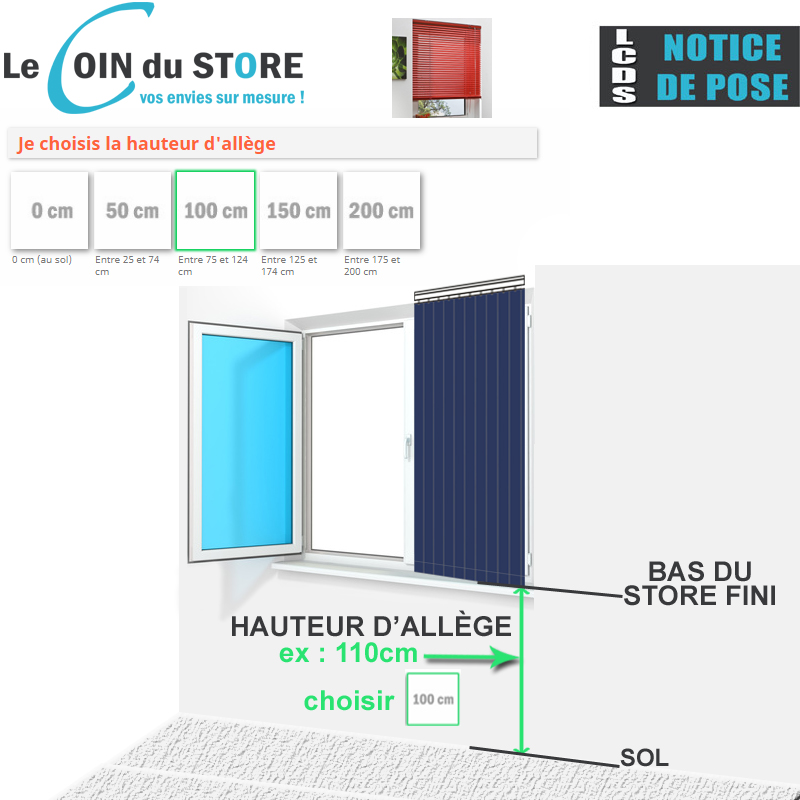 Pourquoi vous demande-t-on la hauteur d'allège ? Lors du passage de votre commande nous allons vous demander de choisir la hauteur d'allège. Pour nous, la hauteur que nous vous demandons est la hauteur entre le sol et le bas de votre store. Prenons un exemple, si vous souhaitez installer un store enroulable, vénitien ou tout autre type de store intérieur, le calcul est le suivant. La hauteur de votre fenêtre est de 1.20 m donc 120 cm...
