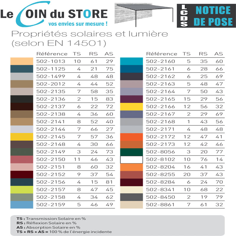 On a tendance à croire que les couleurs claires rafraîchissent plus, mais cela est faux. Les couleurs les plus rafraîchissantes sont les couleurs foncées, car la toile emmagasine plus de chaleur et par conséquent en laisse moins passer. Il fait donc moins chaud sous une toile foncée.