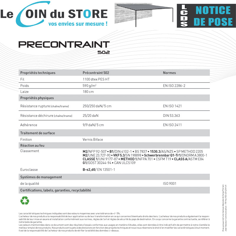 Le précontraint Proof 502 de Serge Ferrari est un matériau composite dotée d'une souplesse et résistance inégalable. Cette toile vous protégera contre la chaleur et les intempéries. Son petit plus est sa haute résistance aux UV et sa large gamme de coloris.