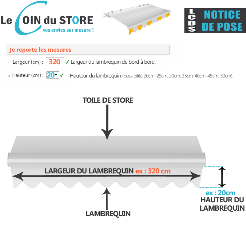 Mesurer sa toile de lambrequin facilement. Pour réaliser cette manipulation, il vous faut : un escabeau et un mètre à ruban rigide. Prise de mesure de la largeur. Positionnez votre mètre au départ de la toile (côté gauche par exemple) puis déroulez votre mètre jusqu'au côté opposé. La mesure que vous obtenez sera à indiquer dans le champ « largeur » de notre configurateur...
