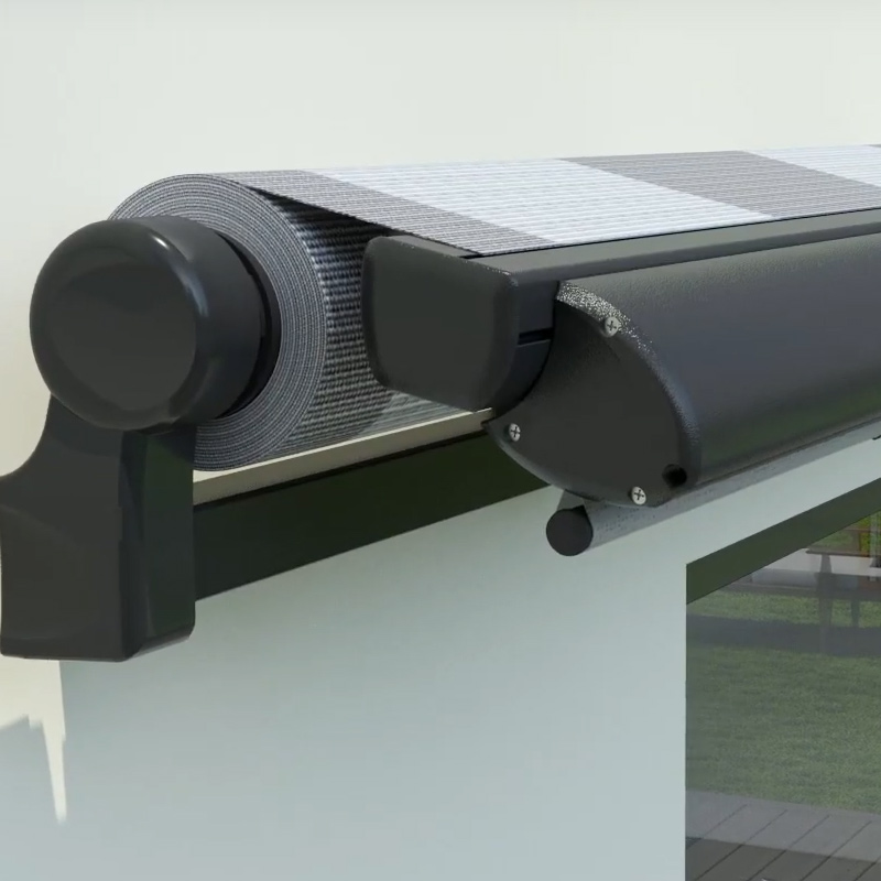 Notre store banne classique combine élégance et tradition avec la fonctionnalité supplémentaire d'un auvent. Cette conception offre une protection solaire efficace et ajoute en plus une couche de protection contre les éléments extérieurs tels que : la pluie ou la neige. Le store avec auvent est une option pour ceux qui cherchent à améliorer l'esthétique de leur espace extérieur.